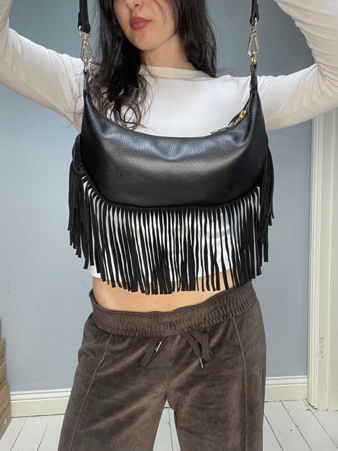 Description – Luxurious Italian Leather Bag with Suede Tassle. Gold Metal Zip on Top with Open Pocket on Inside. Also includes Long Adjustable Strap so can be worn Crossbody Body as well as Over the Shoulder.