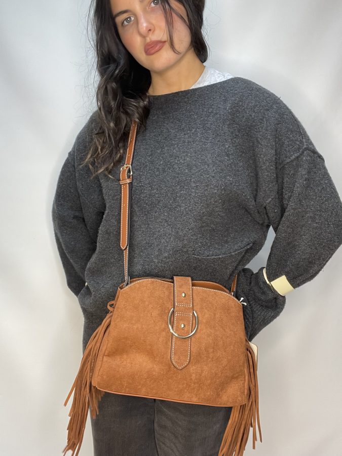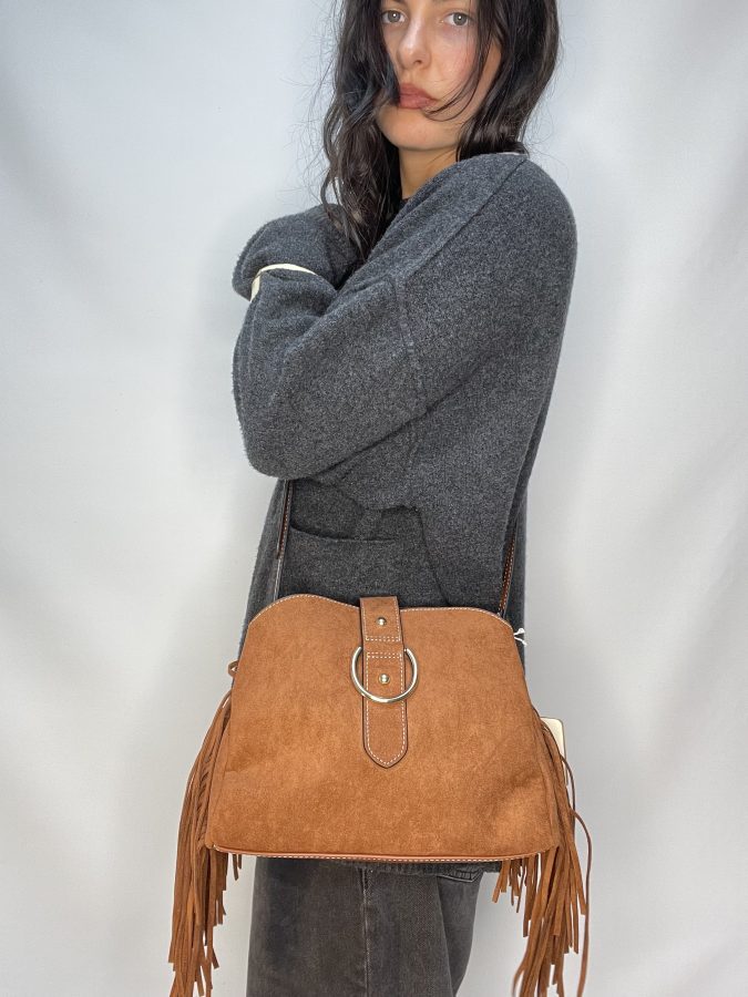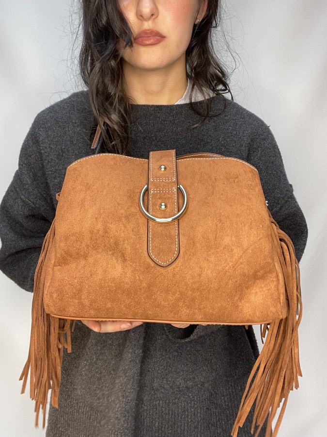 Description – Faux suede Camel bag with Gold Hoop Buckle. Fringe on both sides with Adjustable Strap. Can be Worn Crossbody Body or Over the Shoulder. Zip on Inside with Three Compartments.