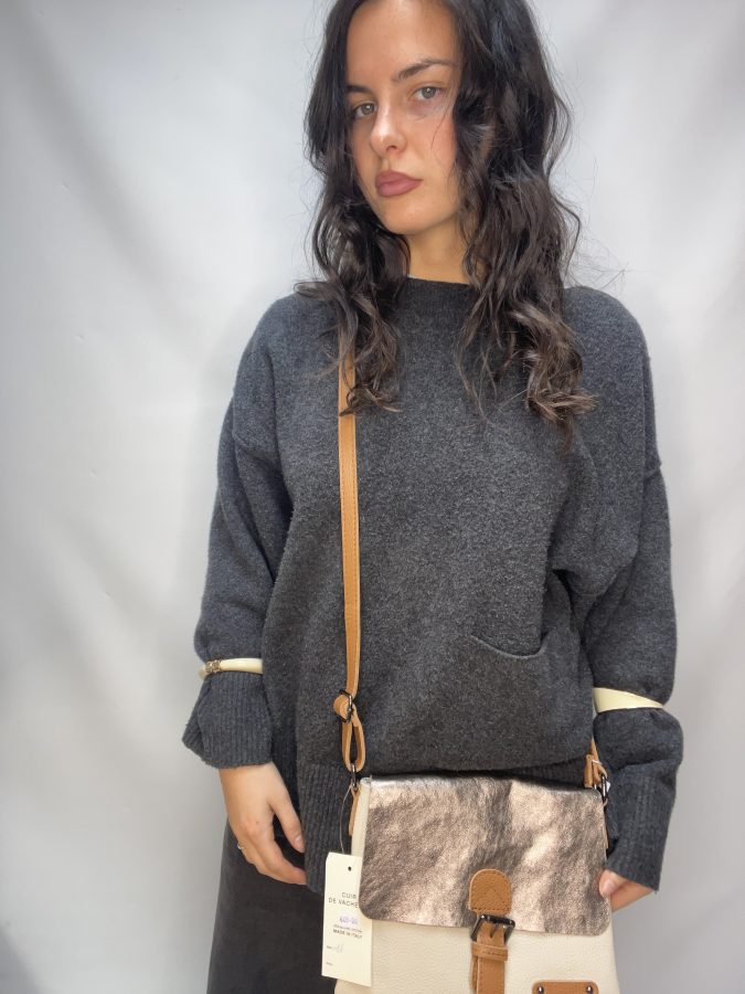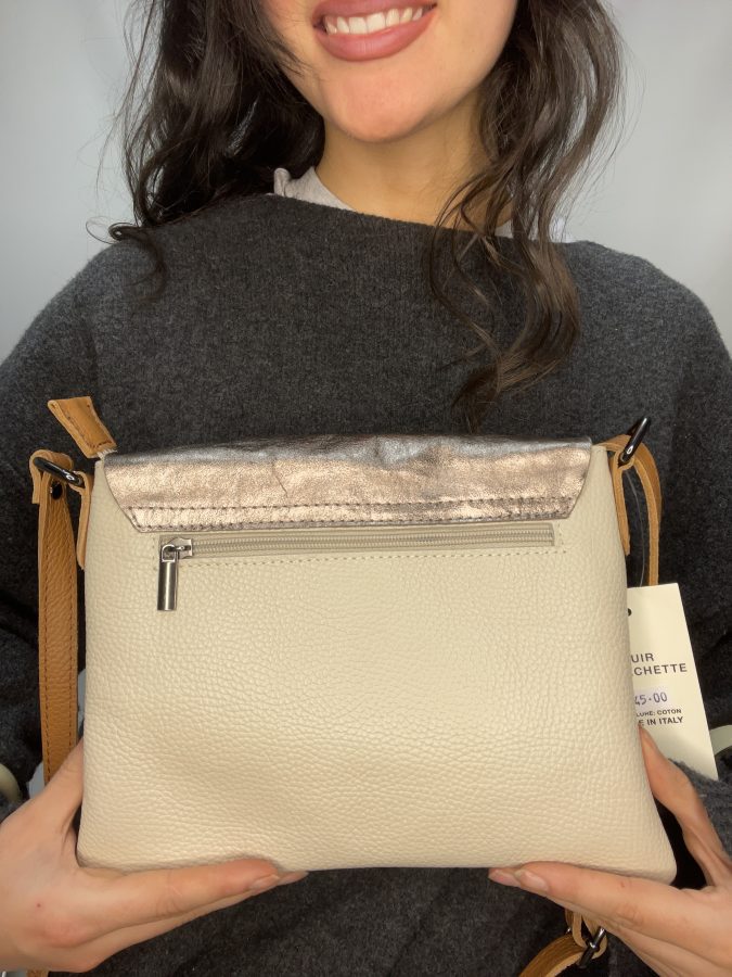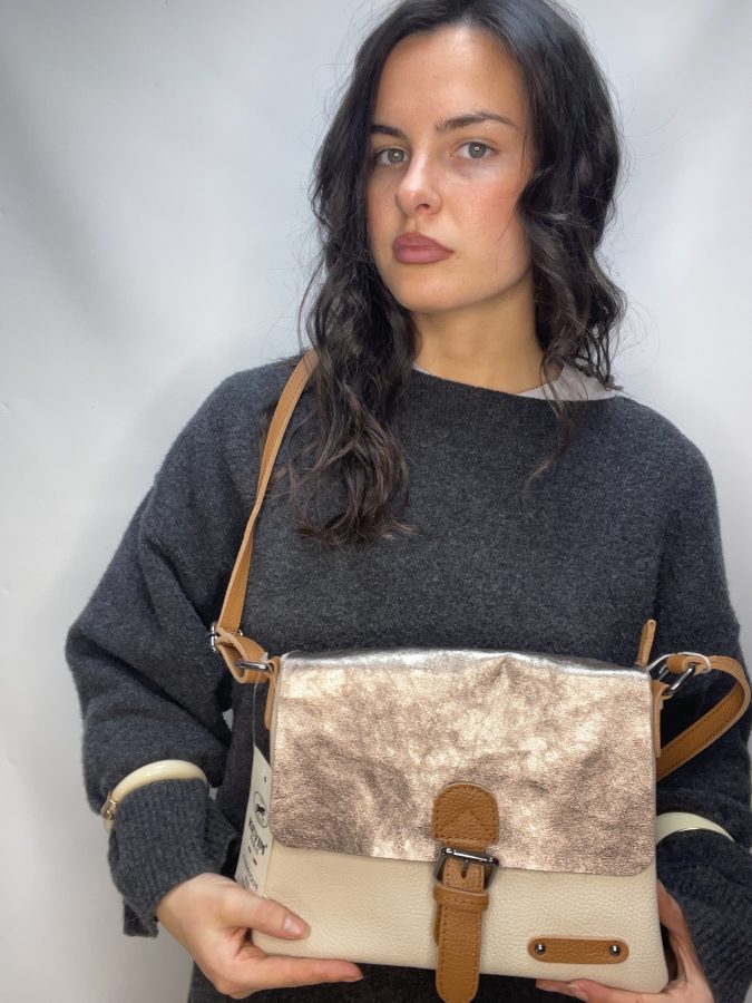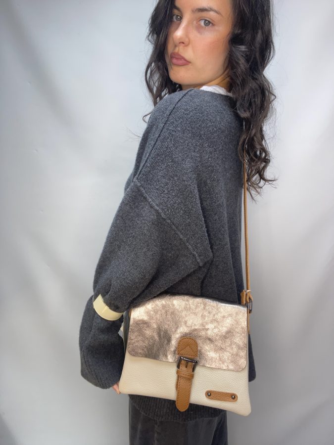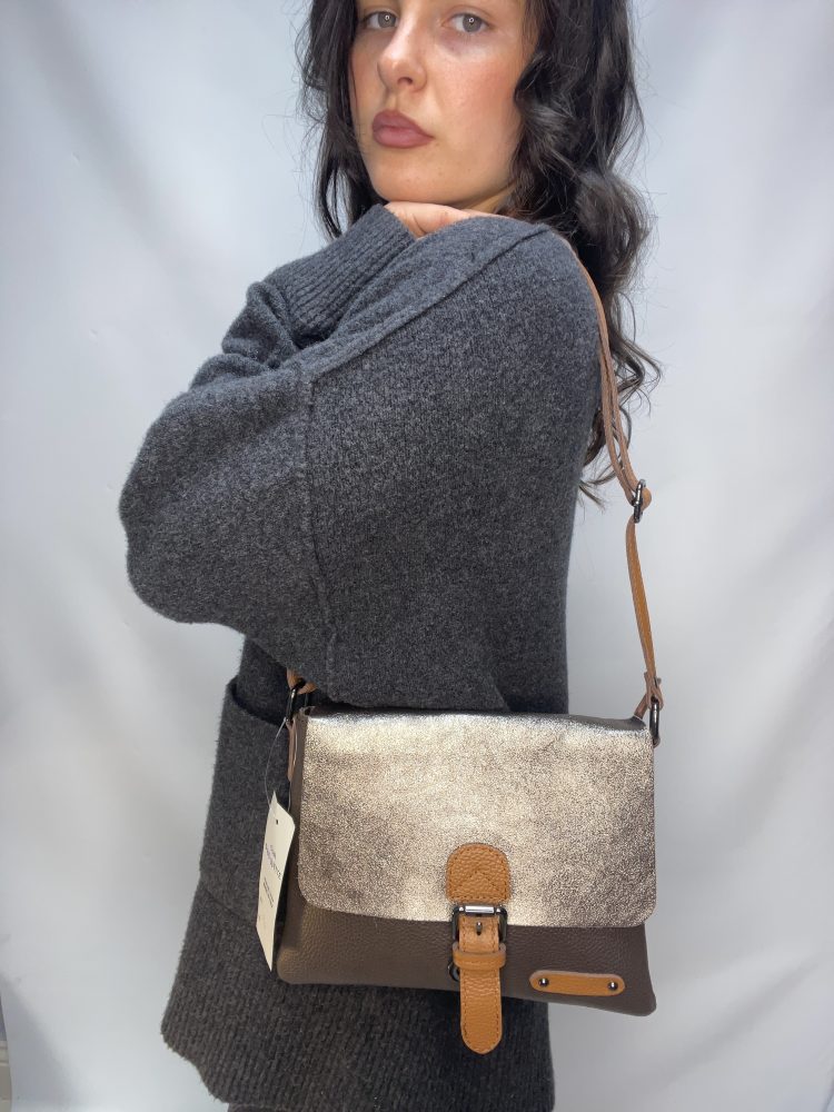 Description – Genuine Italian Leather Bag. Black Silver Buckle with Zipped Pocket on Back, Front and Top of Bag. Brown Leather Adjustable Strap so can be worn Crossbody or Over the Shoulder. One Zipped pocket and One Open Pocket on Inside.