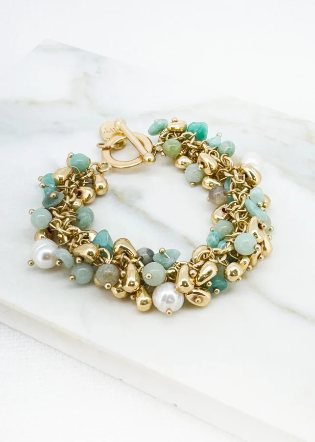Gold Bracelet with Green, Gold and Pearl Beading and T Bar Clasp
