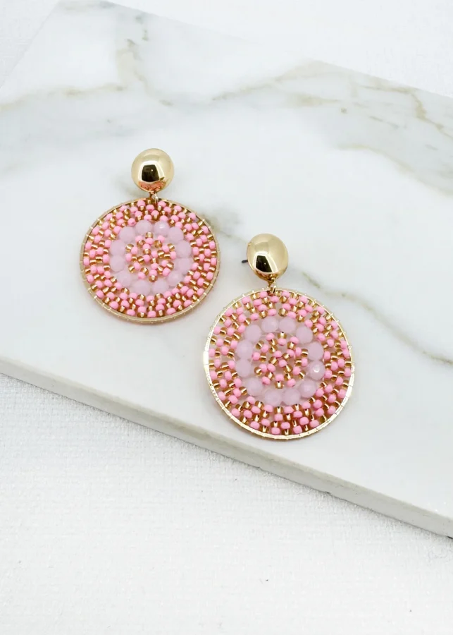 Round Gold Earring with Pink and Lilac Faceted Bead