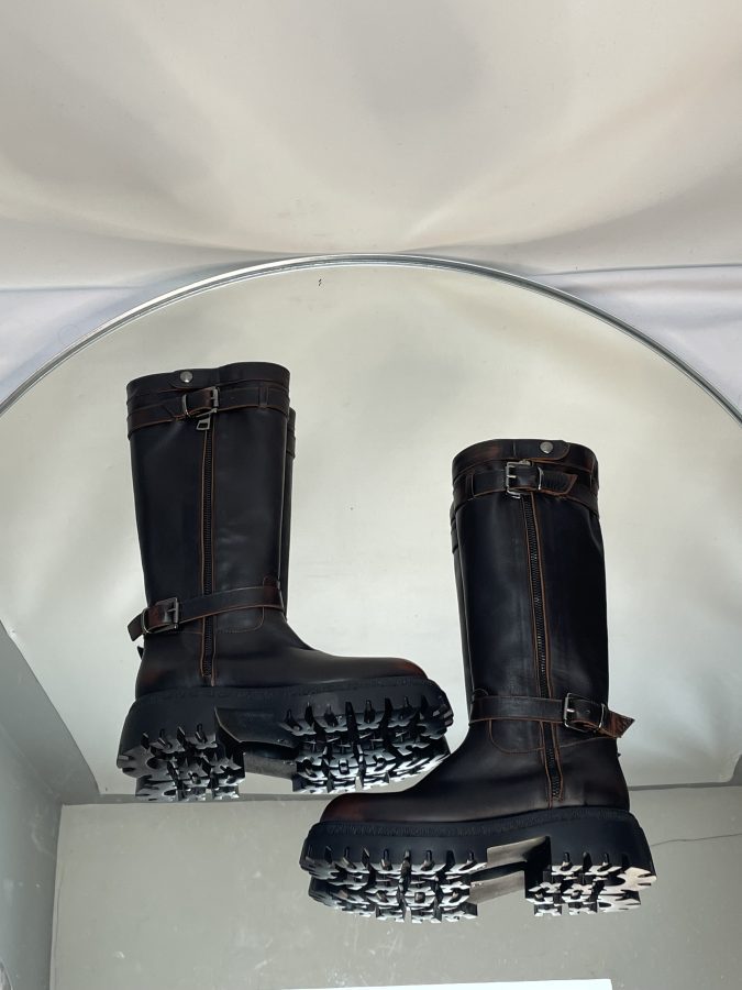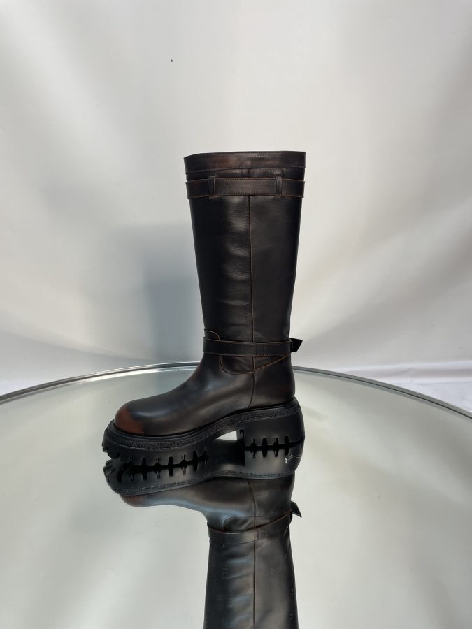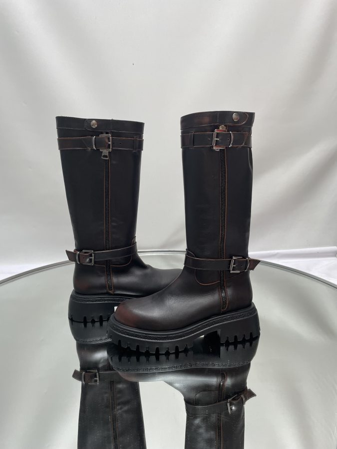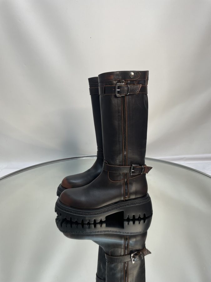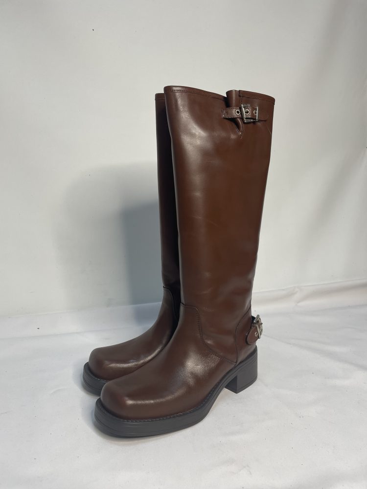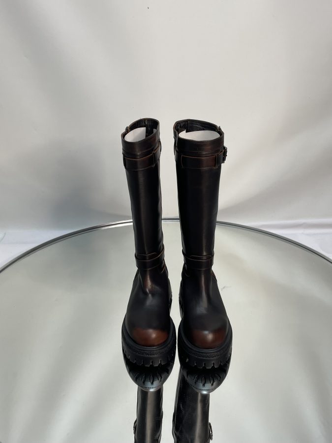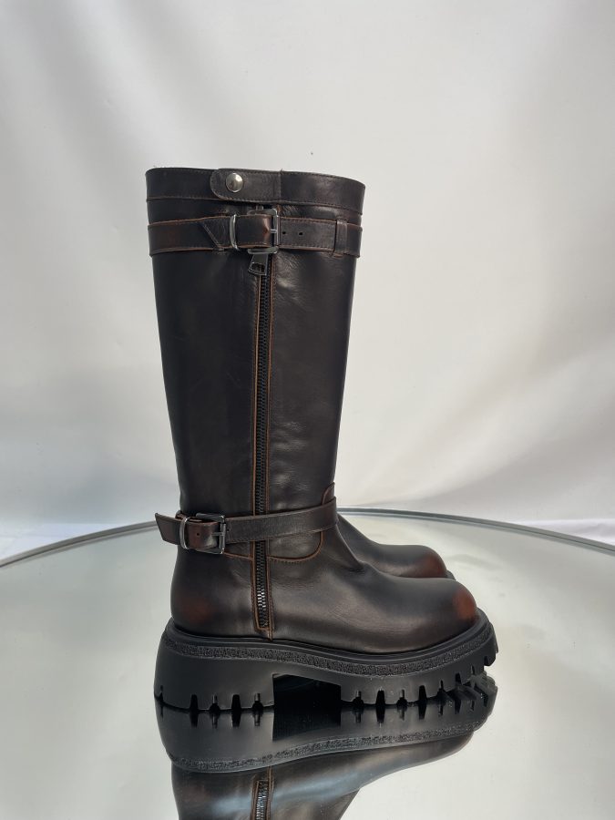 Genuine Italian Leather made in Italy. Boot has brown vintage leather look with buckle on ankle and buckle on top. Silver Chrome Metal Zip down side of boot. Button Clasp on top.