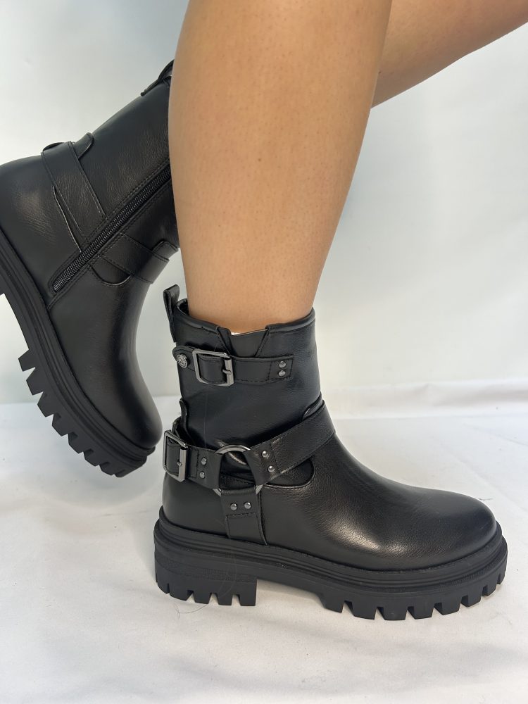 Description – Black Faux Leather Knee High Boot with Silver Hoop Buckle on Ankle.