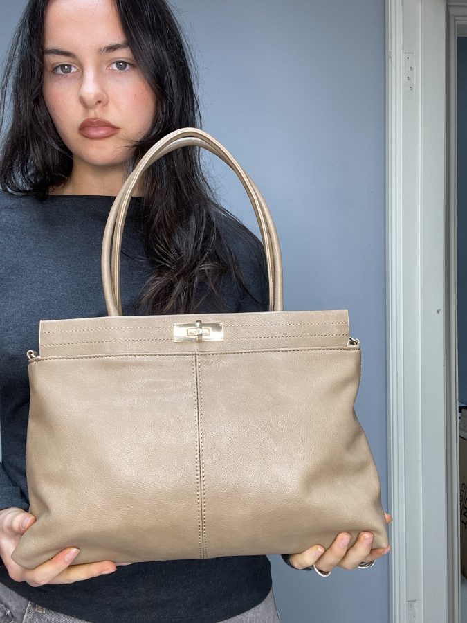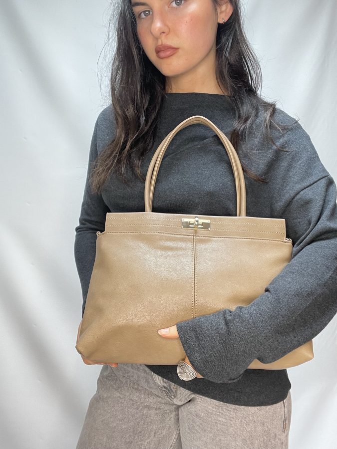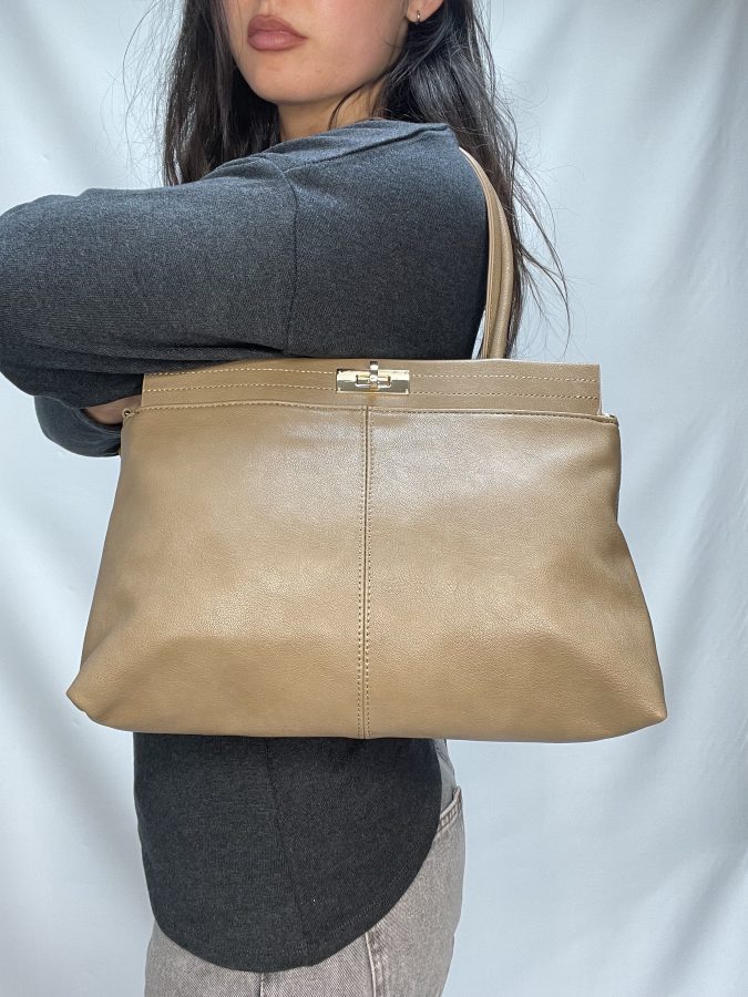 Description – Beautiful Shoulder Bag in Rich Taupe. Gold Metal Zip and includes Adjustable Crossbody Strap. Zip on Top of Bag with one zipped pocket on inside. Also compartment on front which is closed using gold clasp as seen in image.
