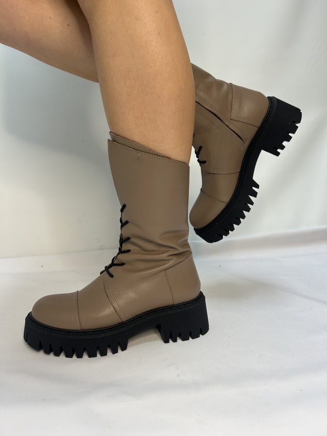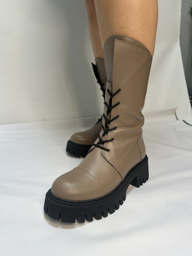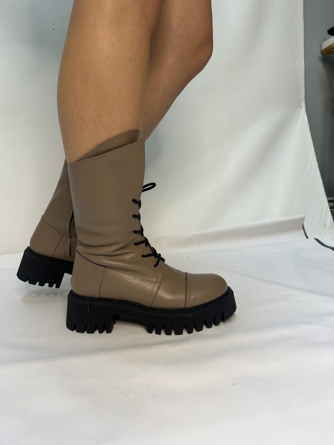 Description- Beautiful Lace up Boot in Taupe. Asymmetrical Cut on Top-line of Boot creating a Gorgeous Unique Look. Black Lace and Black Sole. Boots are made using high-quality materials, carefully selected to ensure durability, comfort, and a unique design.